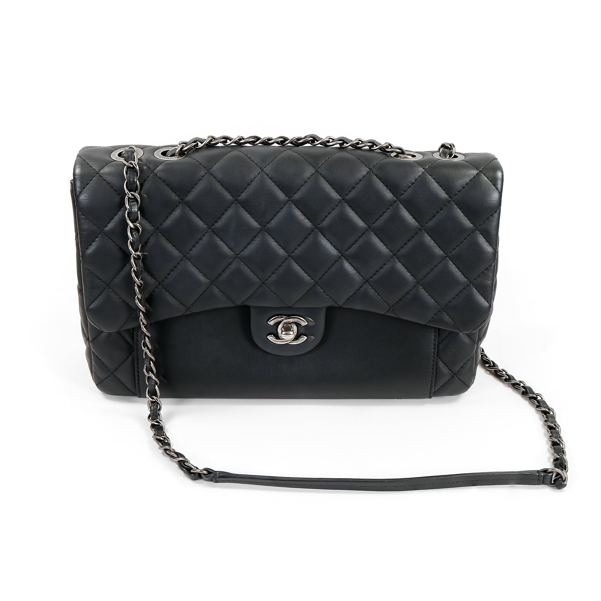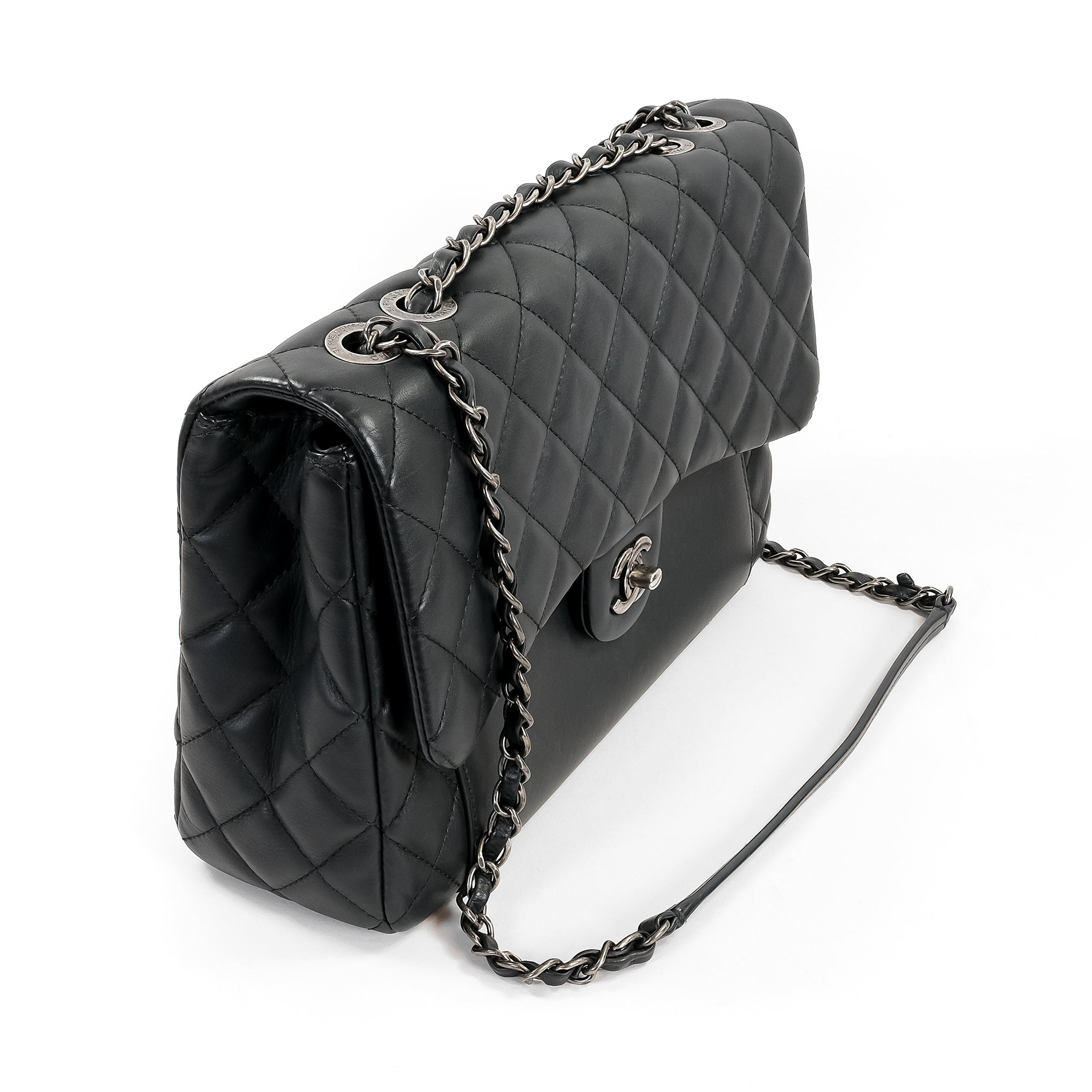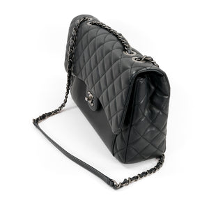 A pre-owned Chanel Black Calfskin Flap Handbag. This bag features a black calfskin leather body with ruthenium hardware details. The bag is in excellent condition and comes with the original Chanel authenticity card, booklets, dust bag and box.