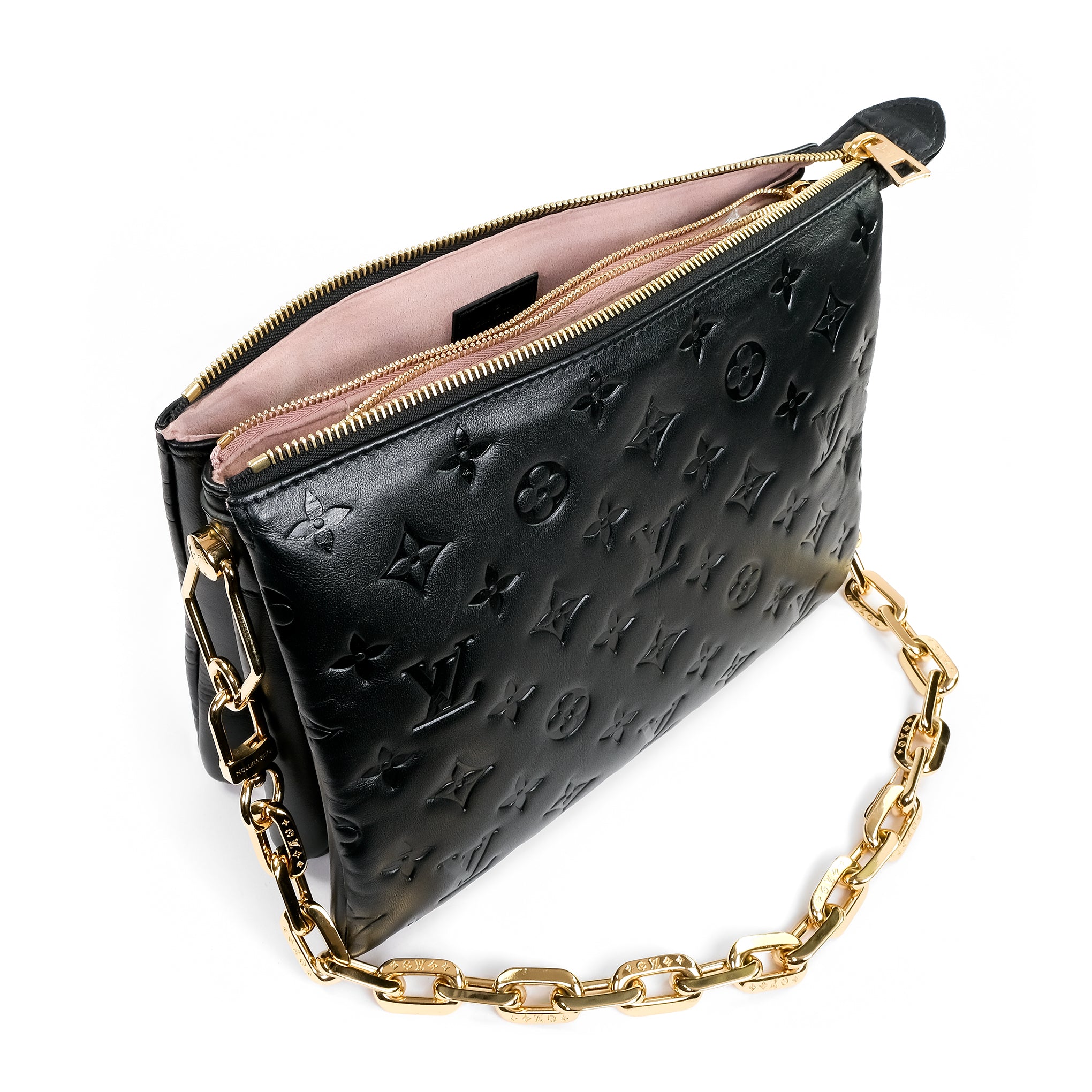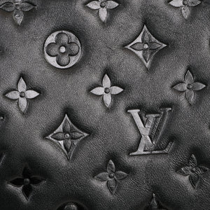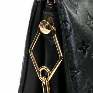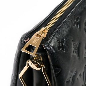 A pre-owned Louis Vuitton Coussin PM women's handbag (Model M57790). This bag is made from stunning black lambskin leather. The bag features gold coloured hardware and comes with an additional strap enabling it to be worn as either a shoulder or cross body bag.