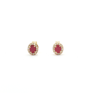 A stunning pair of Ruby and diamond halo stud earrings. Each earring features a 0.20ct oval-cut Ruby and is surrounded by a halo of Diamonds. Made in 18ct Yellow Gold.
