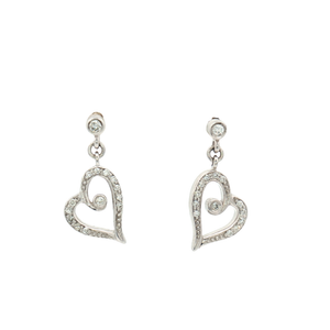 A stunning pair of 18ct White Gold Diamond Heart Drop Earrings. Each featuring natural diamonds set into the heart shape of the earring, and with one diamond at the start of the drop and one in the middle of the heart.
