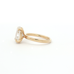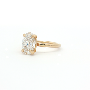 An 18ct Yellow Gold Oval-Cut lab-diamond engagement ring. The centre stone is in a four claw setting and is certificated 3.00ct, F colour, VVS2 clarity. Finger size M (Resizing available).