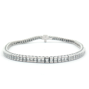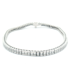 A stunning vintage 18ct White Gold natural diamond Princess-cut tennis bracelet. This bracelet has a total carat weight of 2.90ct with colour F and VS clarity. The diamonds are set in a rub-over setting. Length of bracelet is 7 inches.