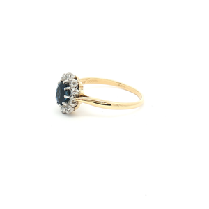 A vintage 18ct yellow gold and platinum, sapphire and diamond cluster ring. The centre stone is an incredible oval-cut sapphire, surrounded by ten brilliant-cut diamonds. Finger size M.