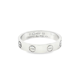 From the Cartier Love Collection. This 18ct white gold love ring features the iconic Cartier screw motif around the outside edge. This is the thinner 3.6mm width version. Size (53). This ring includes its original inner and outer Cartier box and Cartier certificate dated 2022.