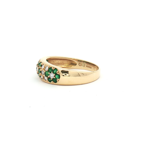 A stunning vintage 18ct Yellow Gold Emerald ad diamond Bombay style ring. It features thirteen natural diamonds and eighteen emeralds.Finger size N (This ring cannot be re-sized).