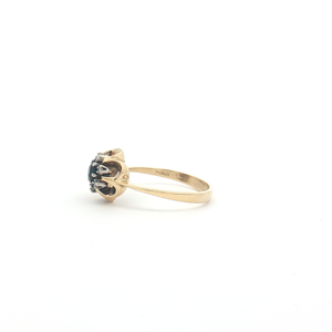 A gorgeous Vintage 18ct Yellow Gold Sapphire and Diamond cluster ring featuring one sapphire and six diamonds.  Finger size O