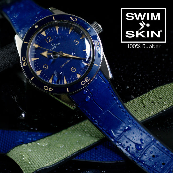 SwimSkin® alligator straps are available in black, brown and navy. SwimSkin® ballistic straps are available in black, dark green, white and navy. Both strap types fit an 18mm tang buckle.