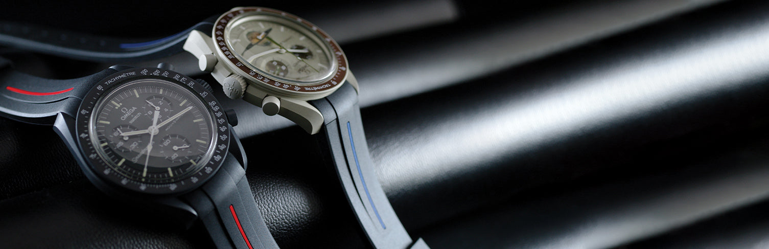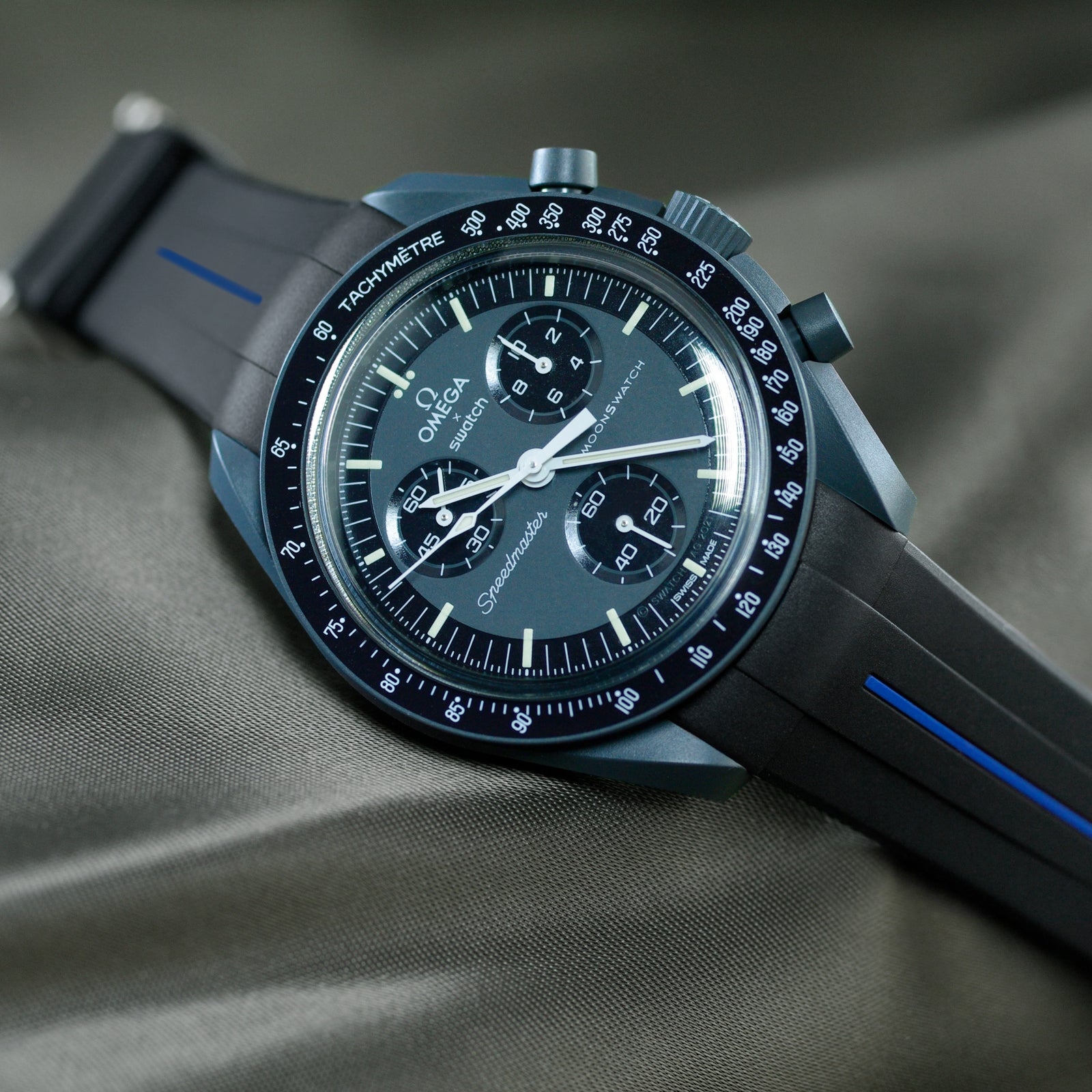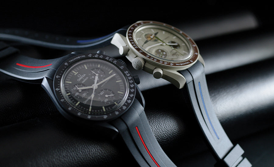 Rubber B straps are available on the Speedmaster MoonSwatch in black, white, orange, blue and red.