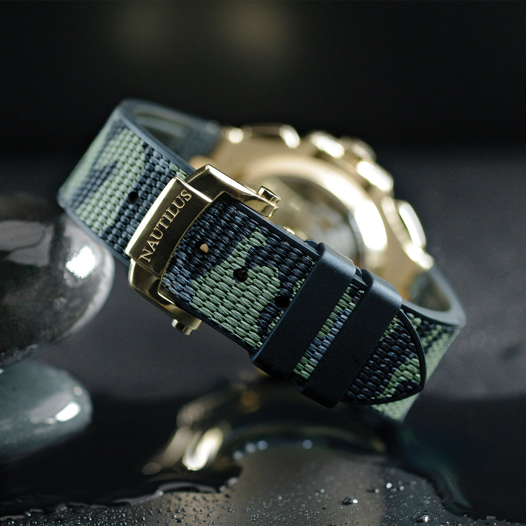 The SwimSkin® camo twill style strap is available in military green/grey dual-colour.