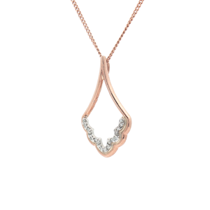 This beautiful pendant has been crafted from 9ct rose gold and features a row of claw-set Diamonds in a 'V' shape at the bottom of inside of the pendant. This pendant also comes with a 16" 9ct rose gold chain.