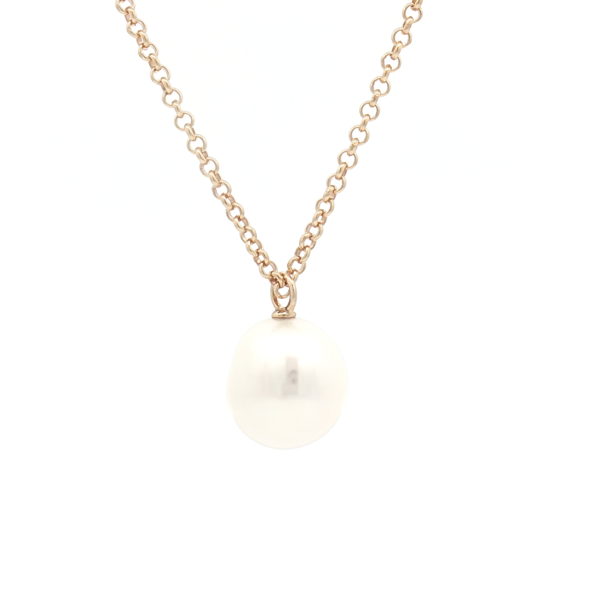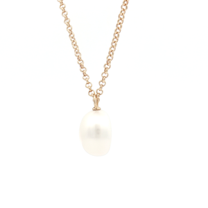 This is a beautiful necklace featuring a stunning Baroque pearl. The chain is a belcher style, 9ct yellow gold and is 18 inches in length.