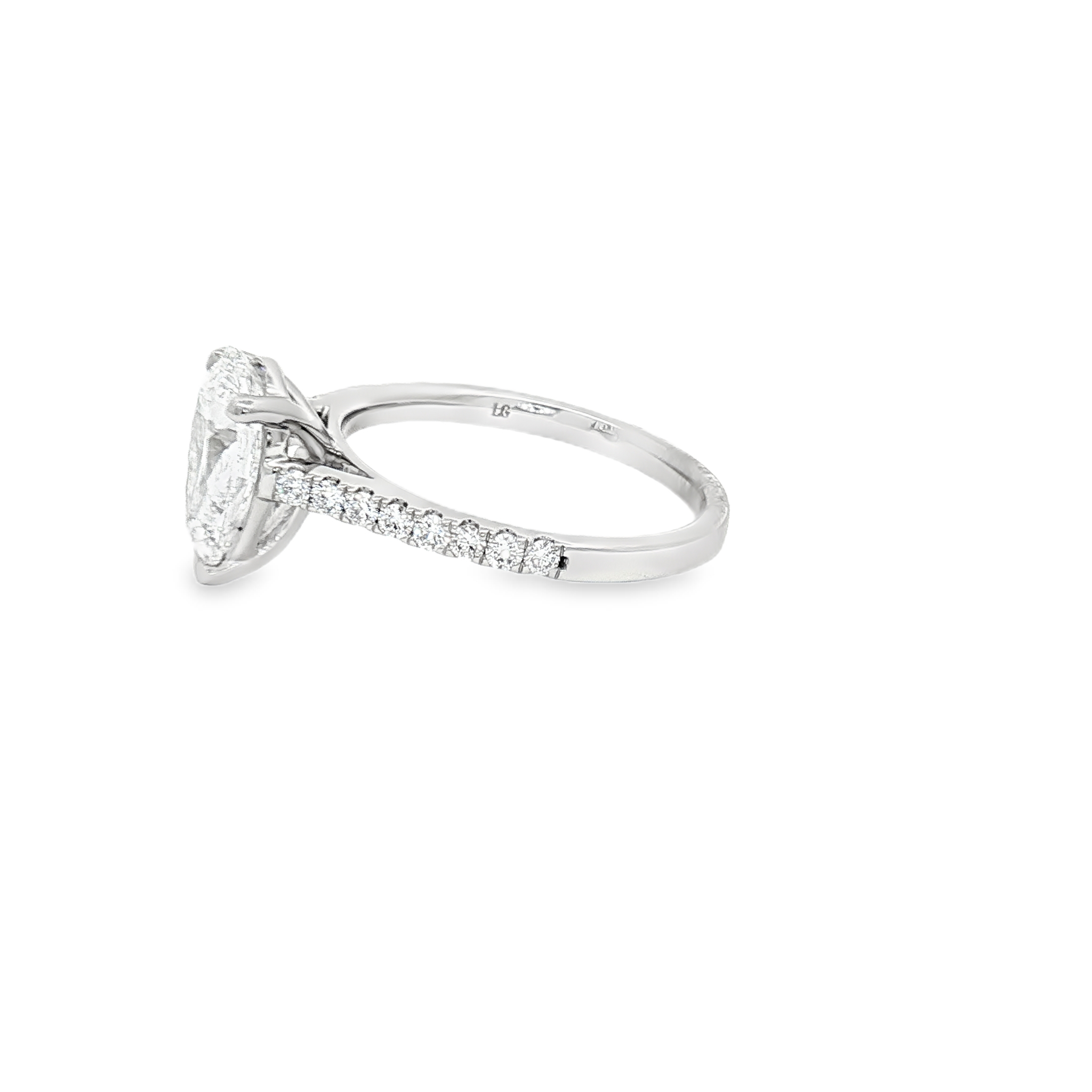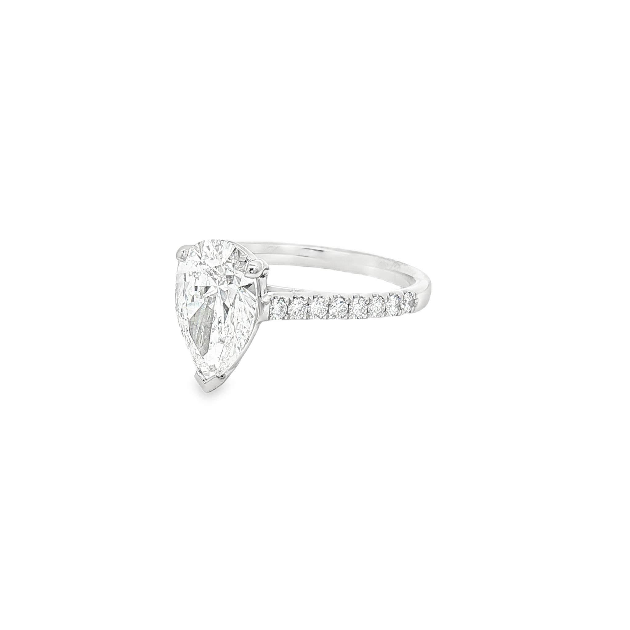 A platinum engagement ring featuring an incredible 2.01ct pear-cut lab diamond. The ring features lab-diamond set shoulders and is a finger size N (free resizing). The centre diamond is certificated 2.01ct, E colour, VVS2 clarity. The total diamond weight of the ring is 2.29ct.