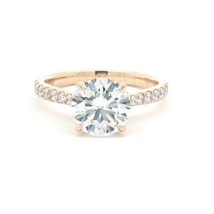 A stunning engagement ring featuring a 2.01ct Lab Diamond Brilliant-cut in a four claw setting with a yellow gold band with Lab Grown brilliant-cut diamond set bridge and shoulders. The centre diamond is certificated 2.01ct, F colour, VS1 clarity. The total carat weight is 2.48ct.