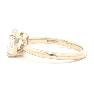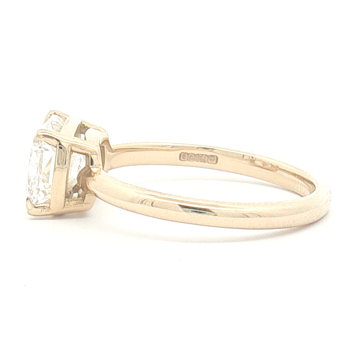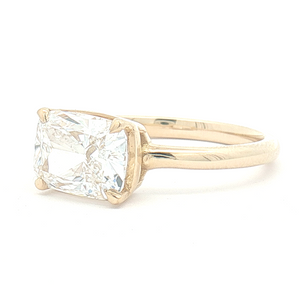 This 2.00ct Lab diamond solitaire engagement ring features an exquisite cushion cut diamond in 18ct yellow gold with a 4 talon-claw east-west setting. The diamond is certificated F colour and VVS2 clarity. Finger Size M.