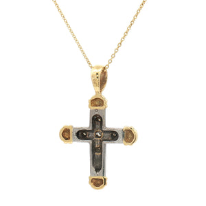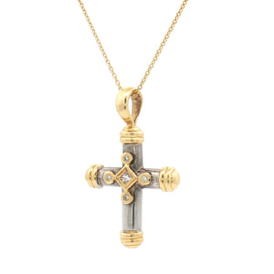 A stunning diamond cross pendant in 18ct white and yellow gold. It features three brilliant-cut diamonds in rub over settings along with a princess-cut diamond in the centre. The chain is is in 18ct yellow gold and is 18" in length.