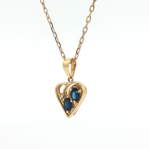 A stunning vintage 9ct yellow gold Sapphire and Diamond Heart shaped pendant. It features two oval sapphires and one natural diamond. The diamond-cut open curb chain is is in 9ct yellow gold and is 18" in length.